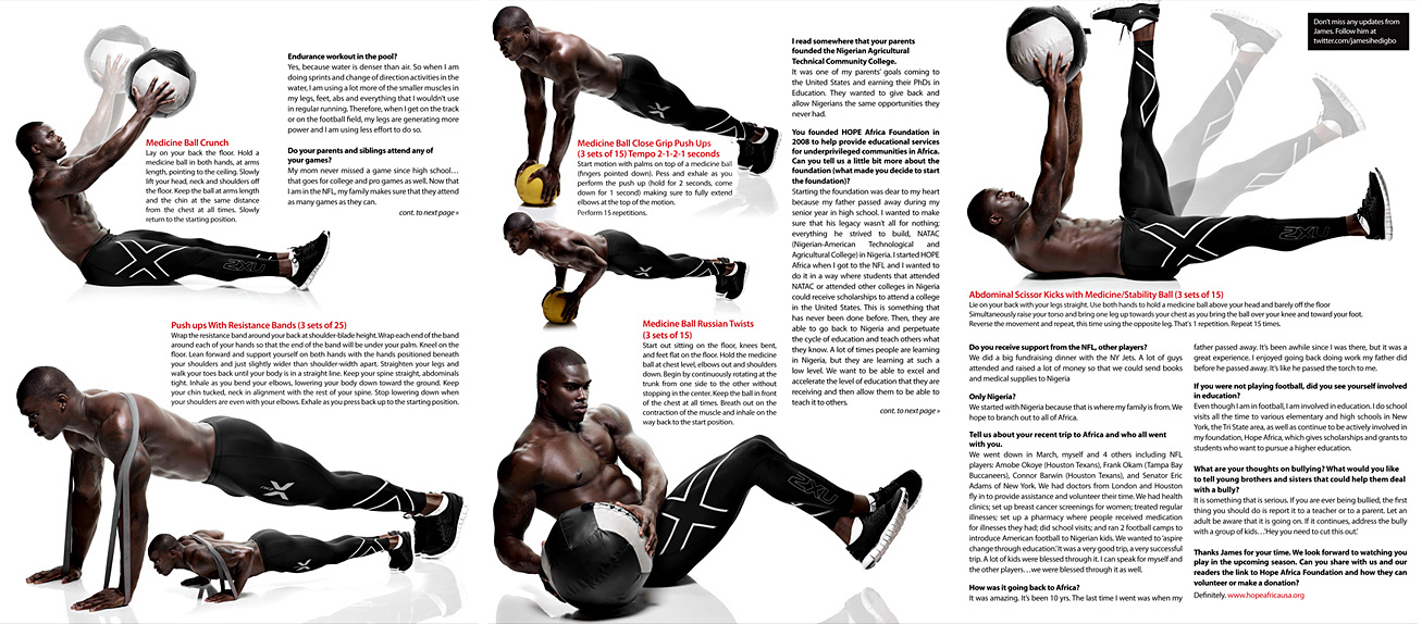 In the fitness photo spread I shot with James Ihedigbo we show his on and off season working regiment, the article and interview also discusses his commitment to continue his father and family Education legacy by Philanthropy endeavors providing medical supplies, school books and raise money for education. Most active where his family immigrated from- Nigeria, Ihedigbo founded the HOPE Africa Foundation in 2008 to help provide educational services for underprivileged communities in Africa. The foundation offers a wealth of assistance to these communities in the form of scholarships, mentoring, funding, and developmental projects.... Ihedigbo has also organised delegations with politicians, doctors and other NFL players to Nigeria setting up health clinics, school visits and American football camps for kids to introduce them to the Sport.