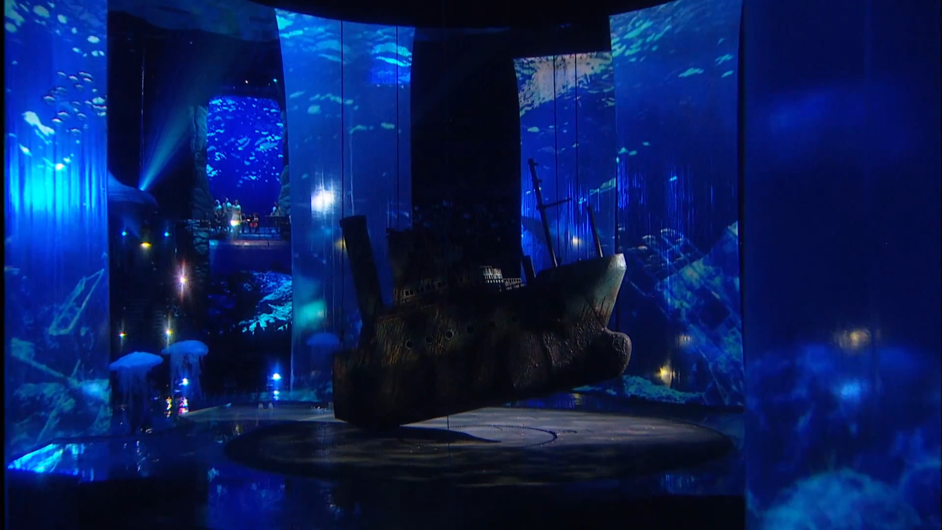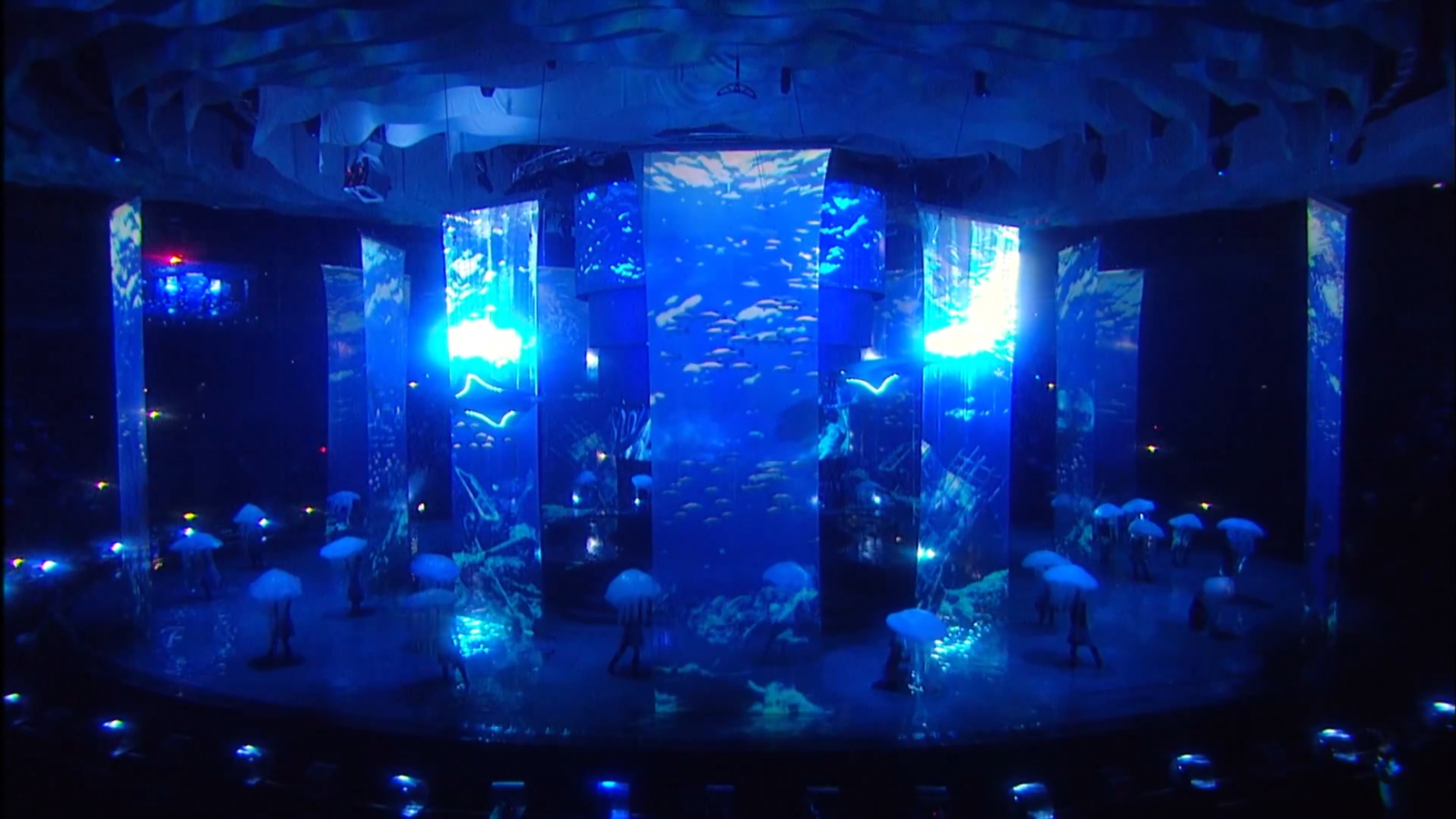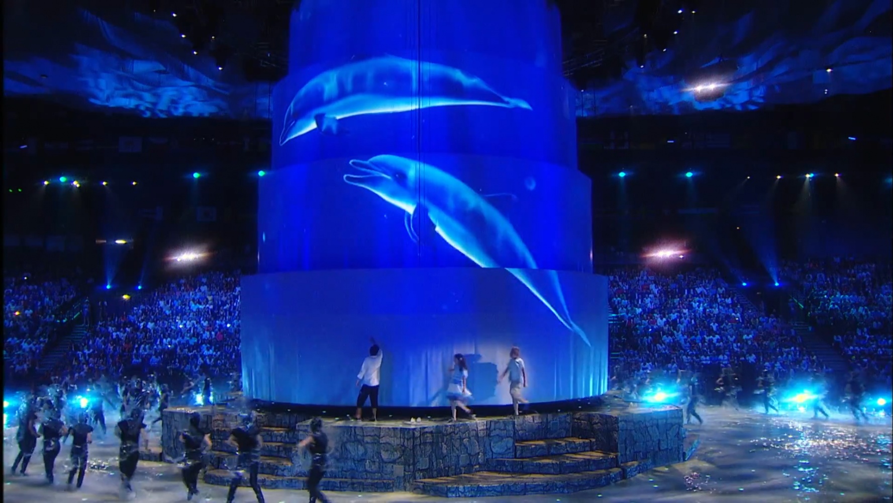 The duration of the ceremony was 2 hours 30 minutes. The basis of the decoration of the play was a multiple cascade of pools with a depth of five centimeters to three meters, the Central projection dome. Stretch projection tulles that stretched straight out of the water. The original Projection video content was coined in style and animation by a team of Lioness experts.